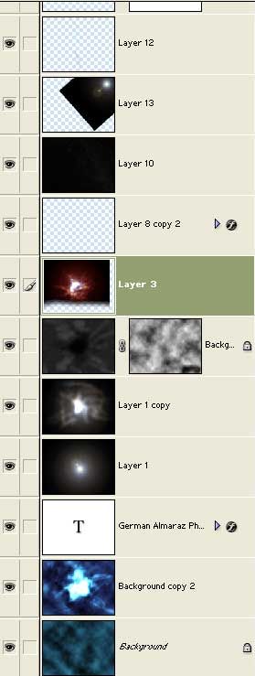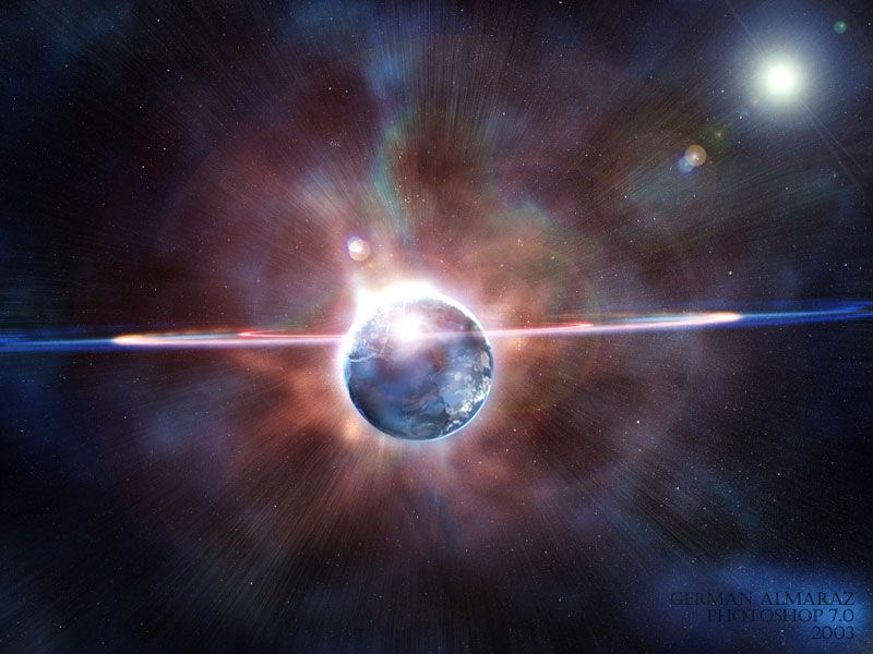Gracias a todos por los comentarios. Oye Percewall me gusta esa imagen. Hola Juanma, la verdad es que no sé cómo explicar detalladamente el proceso pues yo toco por aquí y por allí y luego ni me acuerdo, pero te puedo decir que hice uso de varios render/clouds con blending screen (con varios tonos de color) y use la herramienta dodge/highlight para aumentar la luz en algunas partes además de usar los Lens flares de Photoshop y luego cambiándoles los colores en varias zonas y nuevamente el dodge/highlight, las estrellas de fondo es el mapa que viene en 3ds Max la tierra es una combinación de Photoshop más un mundo que hice con 3ds Max, las ondas expansivas pues unos círculos transformados (Ctrl + t/distort) más un glow de 2 tonos de color con unos borrones por aquí y por allí y duplicados, como verás es una combinación de todo un poco, al final cada quien lo hace como quiere. Saludos.