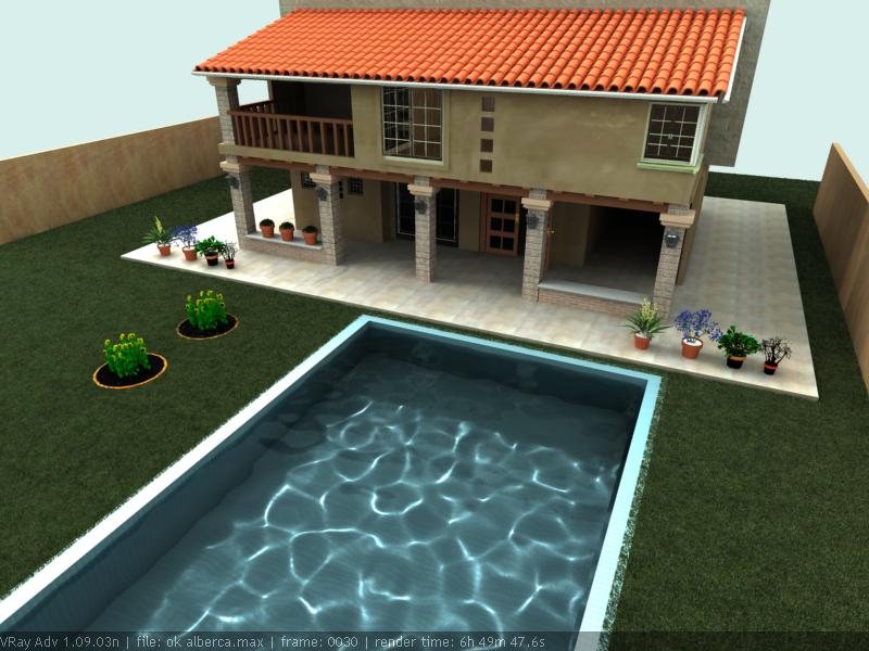 Me gusta el modelado de la escena, en cuanto a las texturas, veo que los colores están elevados, el agua de la alverca parece que fuese agua de rios, no veo sombras solo manchas negras, bueno creo que le falta más trabajo en cuanto a texturas e iluminación.