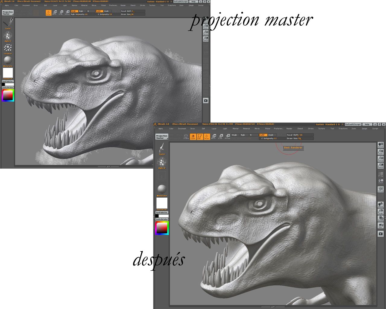 Bueno, continuo dándole al rex, luego terminaré de darle detalle. Para darle más realismo con ZBrush se puede ¿no?