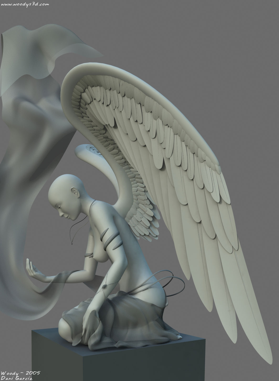 Tiene muy buena pinta, tanto el modelo como las alas. Sin embargo, yo también giraría un poco la cámara para que se viera más de frente, más que nada porque así se ocultaria un poco la unión entre las alas y la espalda, que salen tipo cuerno y tal vez sea poco creíble (digo creíble por decir algo, nunca he visto un Ángel). Además, las alas se verían más grandes también.