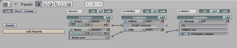 Ahora con el plane2 seleccionado veremos tres veces el nombre del objeto, y al lado del nombre, el botón add. Esto es para añadir sensors, controllers, o Actuators, según qué botón add pulsemos. Vamos a pulsar en el primero. Ahora pulsamos el botón always, y seleccionamos keyboard. Escribimos en las casillas logtoggle i target, el nombre de la variable, en este caso text, esto servirá para que el valor de la variable sea lo que escribamos con el teclado. Os debería quedar algo así: