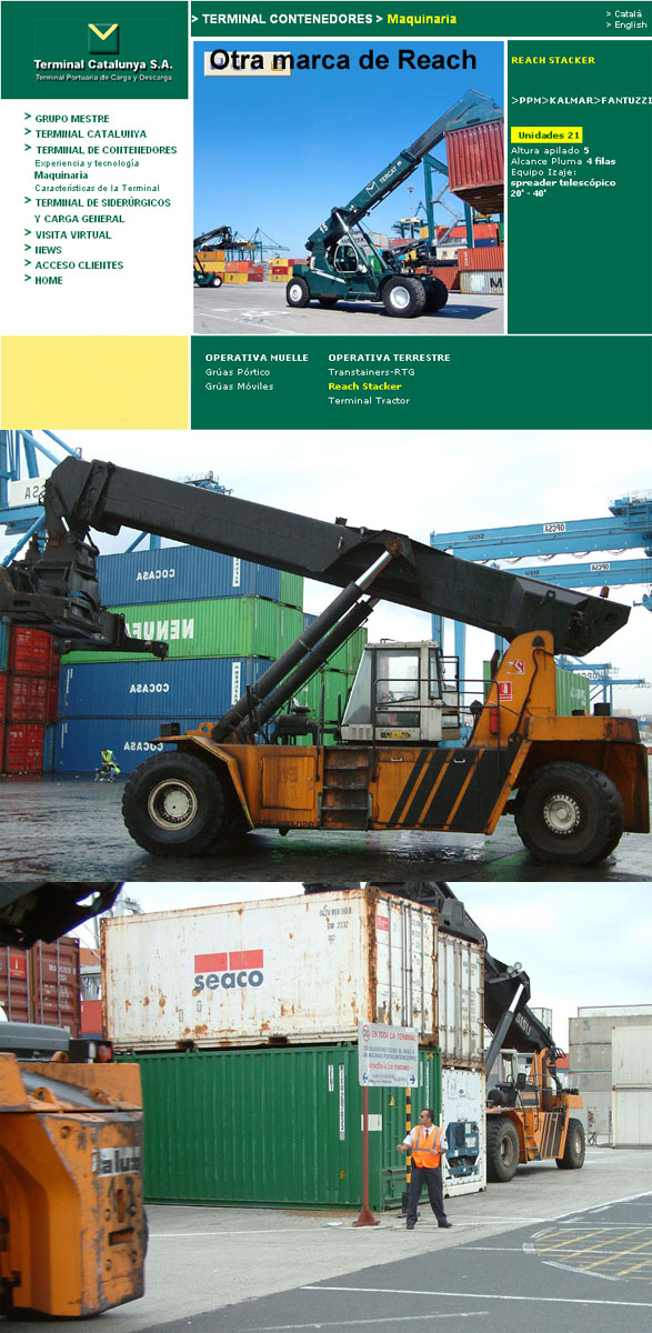 La reach Stacker que hay arriba pertenecen al puerto de Barcelona, concretamente a l empresa tercat que es donde estuve trabando. La verdad es que, si hubiese una persona al lado de la rueda verías que la rueda puede ser bien un metro y medio o más (t lo digo que he estado muchos veces al lado de una e impresiona bastante verla de cerca). Fíjate los container que hay al fondo no están muy lejos y un poco más bajo que una lata (argot de portario).