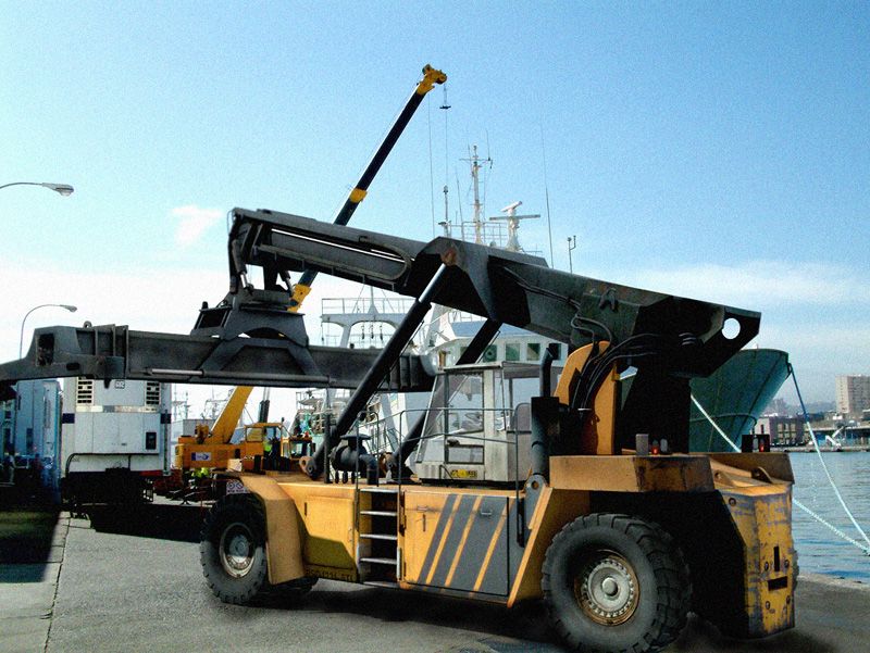 La reach Stacker que hay arriba pertenecen al puerto de Barcelona, concretamente a l empresa tercat que es donde estuve trabando. La verdad es que, si hubiese una persona al lado de la rueda verías que la rueda puede ser bien un metro y medio o más (t lo digo que he estado muchos veces al lado de una e impresiona bastante verla de cerca). Fíjate los container que hay al fondo no están muy lejos y un poco más bajo que una lata (argot de portario).