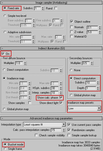 Bajo advanced Irradiance Map parameters>mode, asegúrese que el modo bucket mode is checked. El render es dividido en regiones bucket y cada uno se hizo visible cuando es completado.