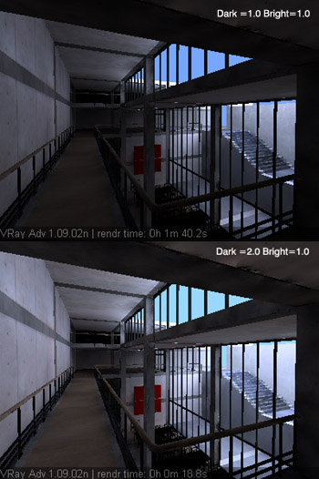 Nota: este ajuste es diferente al color que se adapta y traza un Color Mapping multipliers. Ajustes de mapa en color afectan el resplandor de una imagen basada en la intensidad antes de la salida al VFB (virtual frame buffer), mientras que el cambio de los multiplicadores de GI afecta la contribución de luz de cada rebote durante el cálculo de mapa de ir.