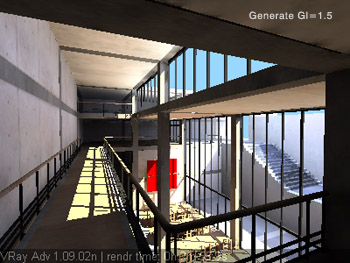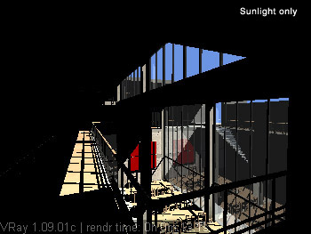 2. Ajustar el sistema de sol para que alguna luz directa entre en los espacios interiores. Apage la indirect illumination (GI) el cálculo para reducir los teimpues de render. La GI no es necesaria ya que sólo queremos ver dónde la luz solar directa penetra en el espacio interior.
