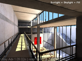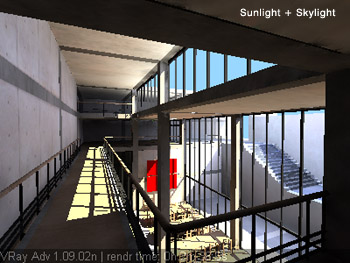 La combinación de Sunlight (directa) y la skylight (indirecto) proporciona bastante iluminación total para el interior. Sin embargo, el render parece tener demasiado azul de skylight.