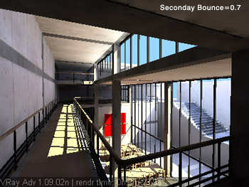 La skylight es dominante debido al valor de multiplicador bajo para el rebote secundario. Para aumentar la iluminación indirecta de la luz del sol, ponga secondary bounce multiplier=0.7.