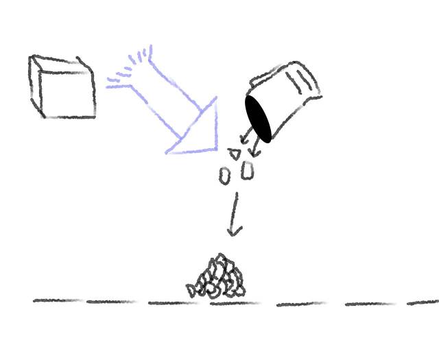 Hola, me han encomendado un pequeño trabajo de animación sobre la utilización de un carbón. En esta animación se ha de ver cómo se echan las pastillas desde in recipiente (envase cilíndrico) i caen a la parrilla junto a las otras pastillas. Cuando pensé cómo hacerlo me salió.Reactor, el cilindro un objeto rígido cóncavo i lo otro Rigid Body, pero el problema es que, sí, no hago animación de los objetos funciona, pero a la que intento hacerle una animación al cilindro para que se guie y caigan las piezas de dentro se caen por los lados i no salen por delante (atraviesan el cilindro), pregunto, ¿cómo se puede hacer esto que parezca que caen físicamente, pero que, si no hace falta Reactor mejor. Dejo un minidibujo de lo que me gustaría que fuese.