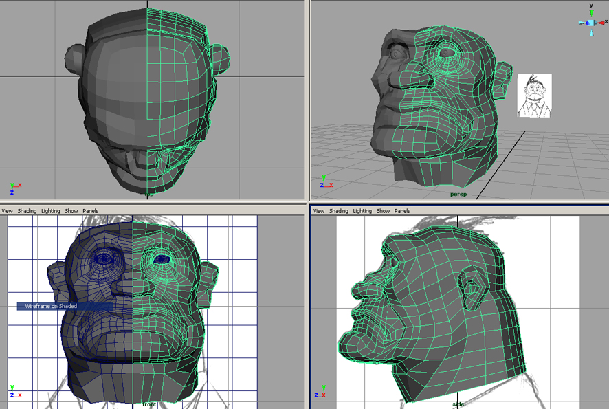 Dios que depresión. Durante el proceso de modelado dupliqué la cara sin darme cuenta, seguí modelando las orejas y después le hice un combine y un merge, entonces me di cuenta de que los vertex estaban duplicados y que me aparecía una horrible división en el centro de la cara, he intentado arreglar esto de varias maneras, pero ya he tirado la toalla, lo tiro a la basura y punto, a otra cosa.