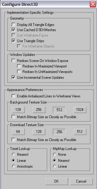 Tengo una Ati x300 en un AMD 3000+ 64bits a 1.8, pero en 3ds Max 7 siento que no la estoy aprovechando de la forma que esta configurada, cabe destacar que se muy poco para qué sirve cada opción de config en el direct 9 dentro del 3d Studio, por eso aquí le dejo la config que tiene.