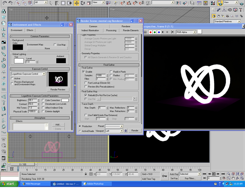 Otra opción es simularlo colocando una Mental Ray área omni en el centro del Torus Knot que lo excluya (para que el Torus Knot no genere sombras), con atenuación inversa al cuadrado y de la intensidad que quieras. Saludos.