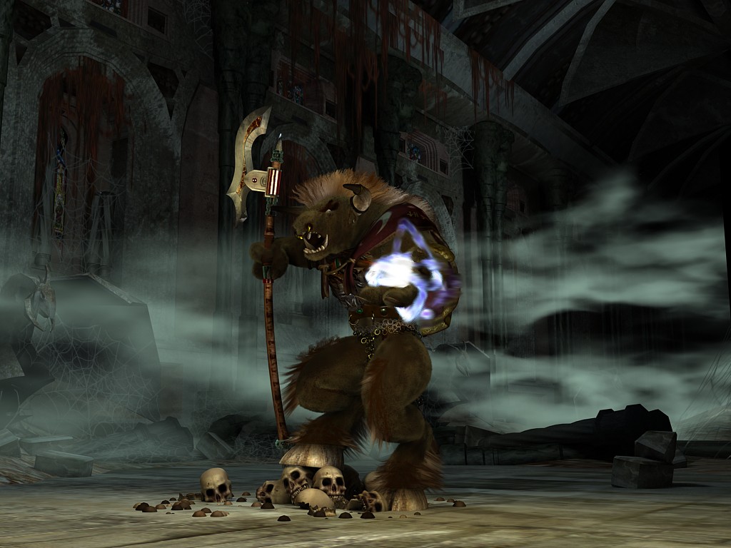 Bueno, aquí tengo mi Tauren terminado con una escena, a ver qué opináis. Eran un total de 600.000 polígonos creo, cuatro luces omni, una direccional con volumétricas de luz, un par de nieblas y todo renderizado con Scanline y Light Tracer. Iba a usar Mental Ray, pero Shag Hair no funciona con ese motor.