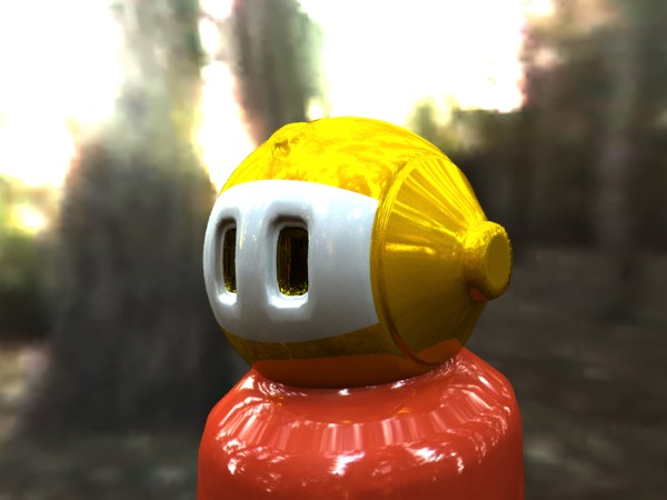 Lo veo bien, pero cambiaría un par de cosas. A la parte blanca del robot dale volumen para que no quede al mismo nivel que la parte amarilla, con un extrude yo creo que quedaría mejor. Ponle unos ojos con un material auto iluminado, siempre le da algo de gracia a los robots y cambia el fondo, si no me equivocó ese el fondo del mapa HDRI ¿no? Busca una imagen de un bosque y montalo en Adobe Photoshop, Gimp o lo que uses. Yo creo que así quedaría mejor. Suerte y sigue dándole.