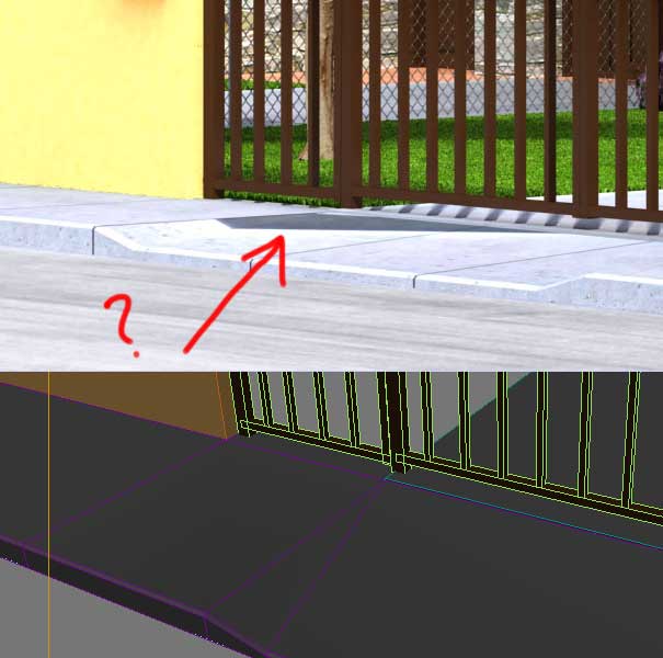 Yo te diría que me canta la saturación del muro amarillo. Si lo desaturas y le das un pequeño Bump mejor. El asfalto es demasiado claro y se confunde con el bordillo de la acera. También le acentuaría un poco el efecto de la piedra en el muro. Quizás añadiéndole más Bump o un displace, para romperle un poco las esquinas y las sombras tan rectas que tiene. Debería ser más irregular.