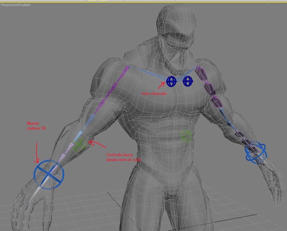 Bueno,lo que veo raro en este previo, es que cuando tira el brazo hacia atrás los músculos se estiran mucho. Es porque los dummies que están en los extremos están alineados con el pivote del bone del hombro. No es realmente un problmea, pero eso provoca que, por ejemplo, si el bone del hombro rota, arrastre a los dummies de los muculos con él, haciendo rotar un poco los músculos. No sé si me explico. He probado a hacer un position constraint en lugar de linkear los dummies al bone del hombro, pero no funcionase te tenéis alguna seguerencia adelante, a ver qué opináis, Promineo sabes lo que quiero decir¿no sé si te ha pasado a ti alguna vez.