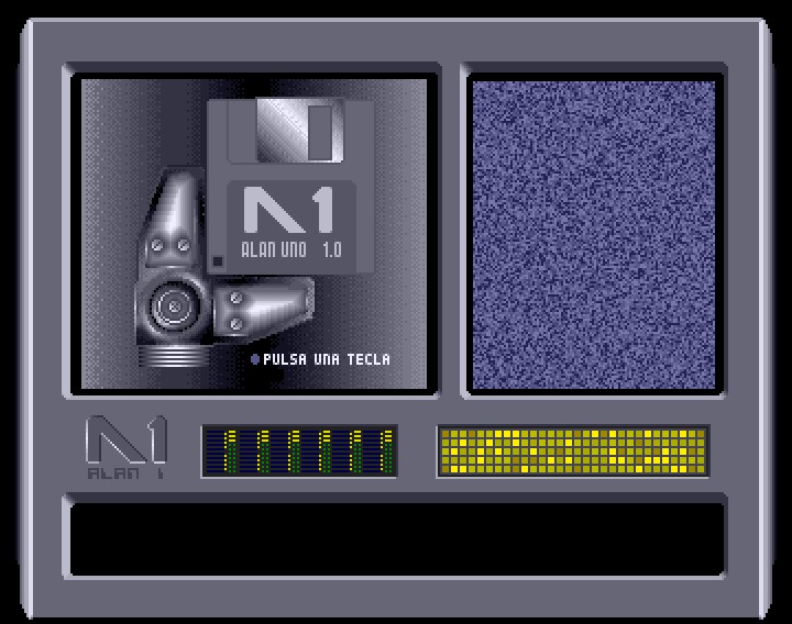 Aparecerá una pantalla blanca, después unas rayas de colores horizontales (rutina de carga) y empezara la introducción donde podréis leer un poco de la historia y aprender lo básico del funcionamiento, os recomiendo que la primera vez os leáis todo el texto para saber bien cómo funciona el programa. Para las siguientes veces, podéis pulsar el botón izquierdo del ratón para saltar la introducción, después aparecerán de nuevo las rayas de colores y después aparecerá por fin Alan-uno. A partir de ahí estáis solos.