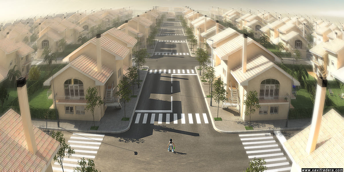 Esta es la tercera imagen sobre la serie barrio. La casa principal fue modelada en Autodesk architectural desktop. Luego moví toda la geometría a 3ds Max 7, donde añadí las texturas, iluminé la escena, creé la calle principal, los jardines y añadí los árboles. Después cloné la casa para crear el barrio entero. Usé Vray 1.47.03 como motor de render. Finalmente añadí el background en Adobe Photoshop, donde también retoqué el color y añadí efectos.