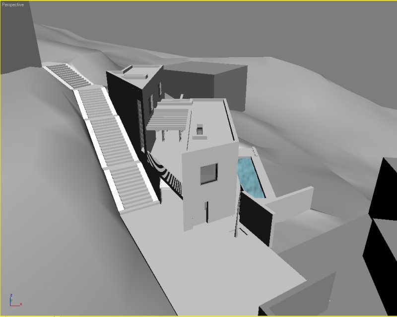Hola a todos, esta es la primera vez que expongo uno de mis trabajos. Aún estoy aprendiendo a utilizar bien el 3dstudio. El caso es que estoy en la lección de iluminación, y me toca hacerlo con esta casa que os pongo a continuación. Necesito iluminarla por fuera, iluminación exterior y luego iluminación interior. Necesito iluminación del sol para hacer un pequeño estudio o simulación solar. El sol sale por la piscina que es el lado este de la casa.