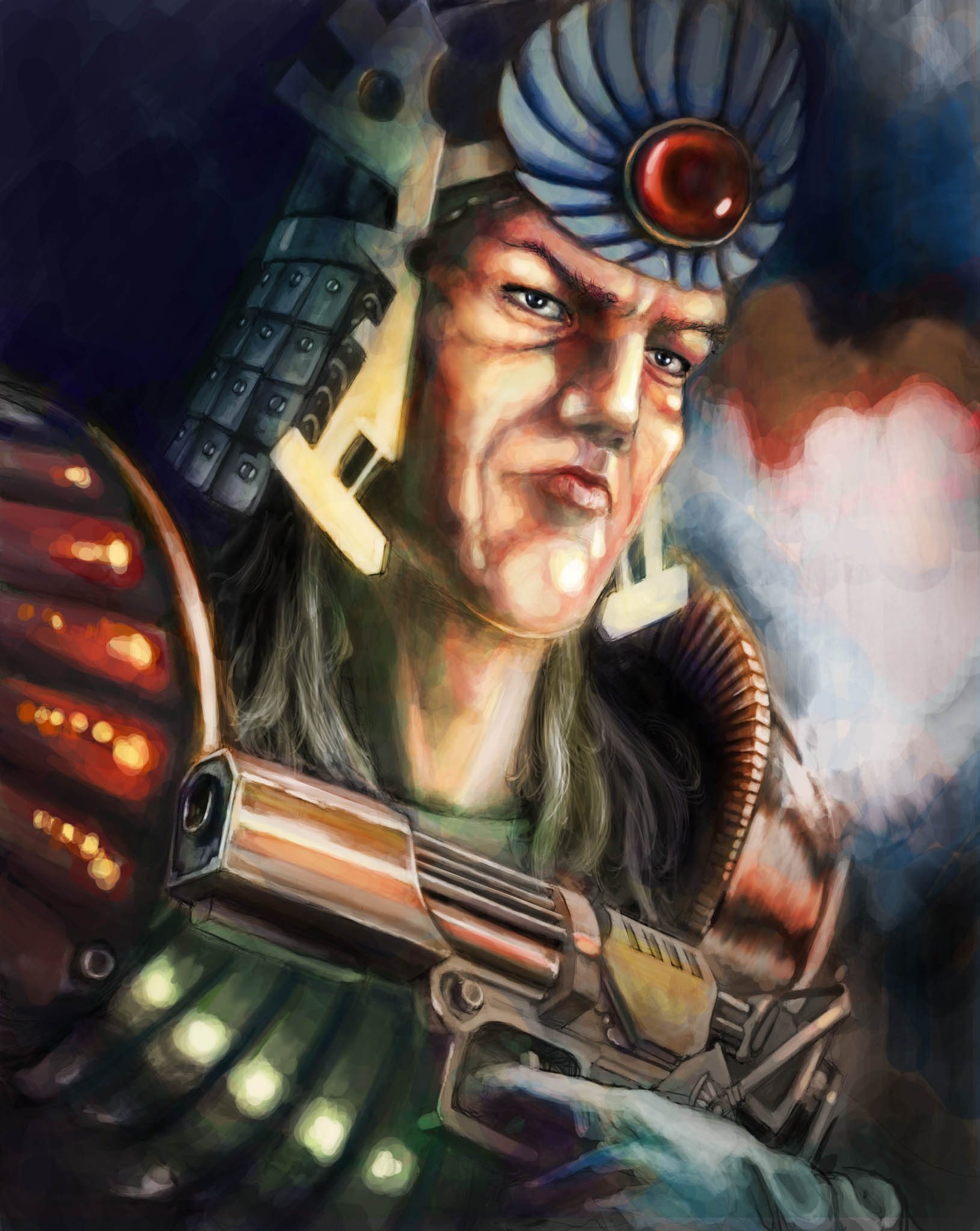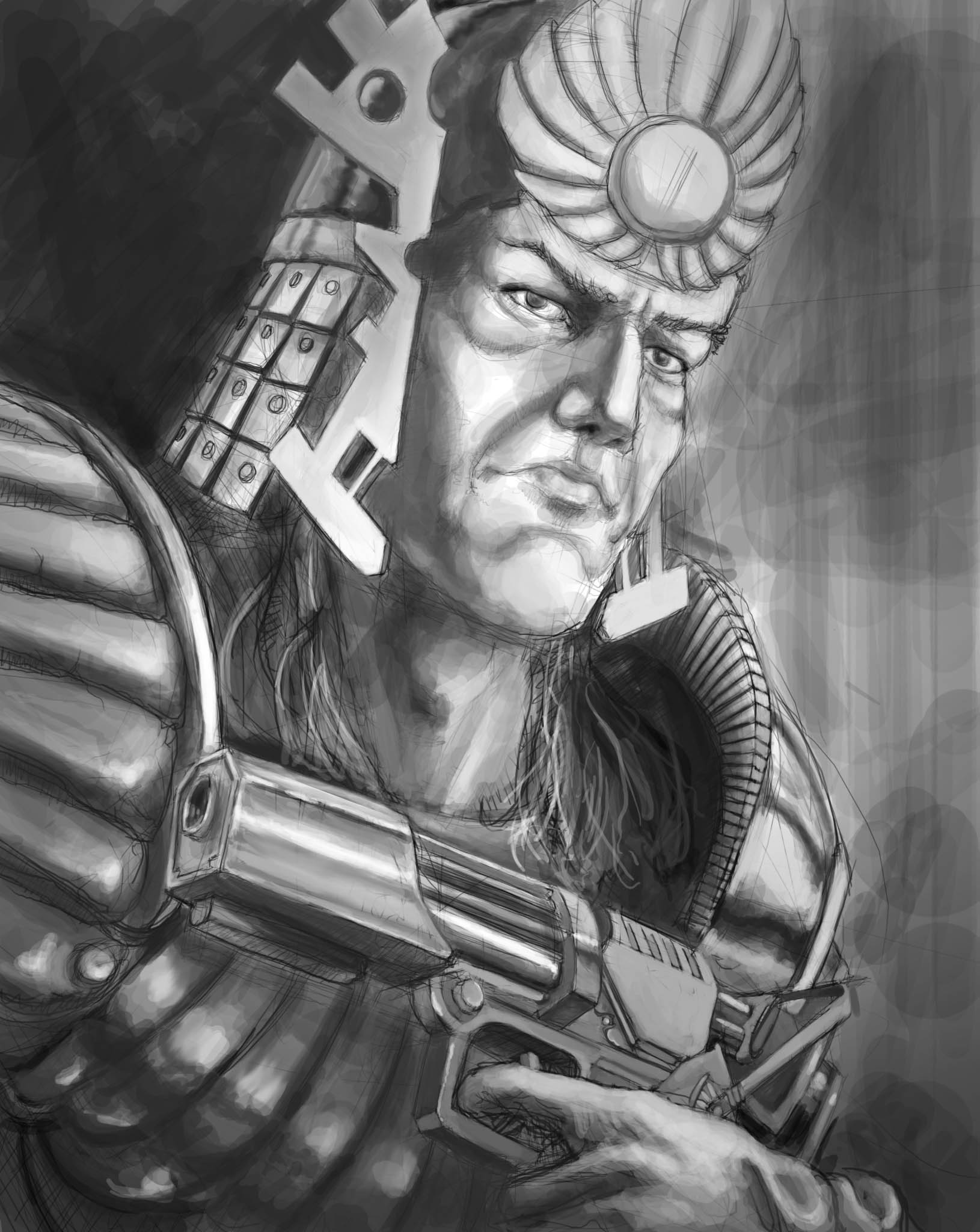 Como crítica te diré que te has pasado con los golpes de luz (esos brillos especulares) en la hombrera y en el pecho, por ejemplo, y en el paso de la versión en grises a la versión color has perdido mucha unidad, es decir, has destruido algunos bloques y facetas principales, en la cara, por ejemplo, has creado varias formas que en la versión de grises mantenías en un solo bloque y eso le daba gran solidez a la figura.
