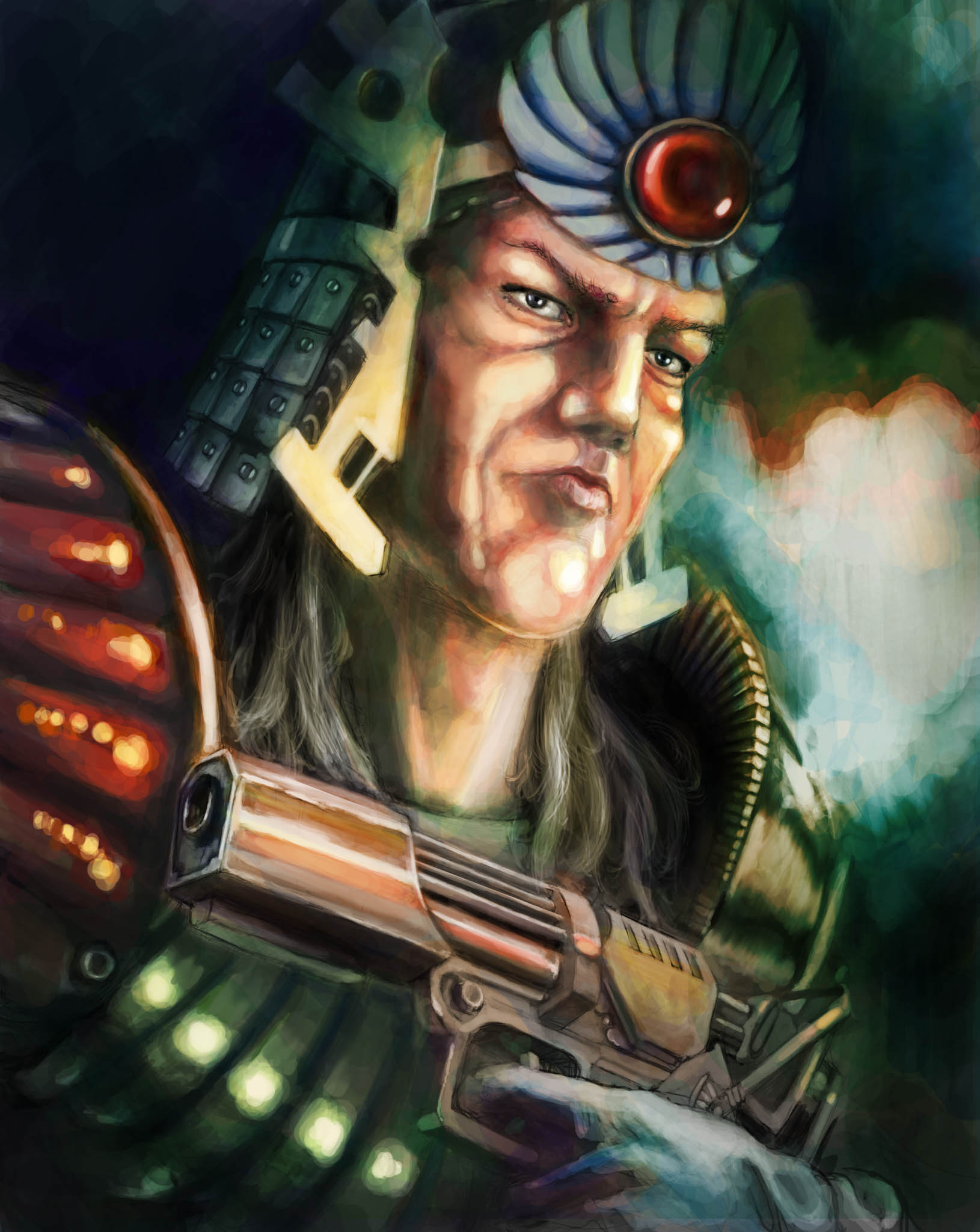 Los que más me molesta son los errores en el dibujo, el casco, la pistola y la nariz, de todos modos el paso a color a ganado mucho y la técnica es interesante. Eso si creo que has saturado demasiado el color perdiendo un poco la oscuridad que me transmitia antes el personaje.