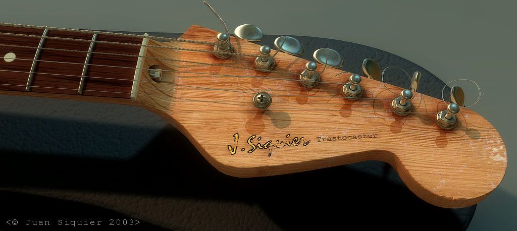 Buenas Siquier, como siempre muy bueno. Mi opinión. Bueno primero una pregunta un poco obvia, hay 2 luces en la escena ¿no? Después lo de las cuerdas que dice Drakkhen estaría bien arreglarlo, el material que hay debajo de la guitarra no me gusta, el Bump se ve un poco irreal y ese borde tan afilado en la parte superior no me convence, después una cosa que me pasa no sé por qué, el tornillo en cruz que hay en la guitarra, No sé por qué cuando lo miro parece que está flotando sobre la madera, lo veo raro, no sé si serán estos ojos que ven cosas donde no hay, después el borde de la madera me gustaría saber si todas esas imperfecciones que, aparecen, como muescas que quedan cojonudas, están hechas con la textura o a base de modelo, y por último, cuando te refieres a Vray 1.09 advanced a qué te refieres, a la última demo? ¿Le quitas las letras después en postproducción? O por hola eres tester de Vray y tienes la demo sin letrillas. Venga un saludo campeón.