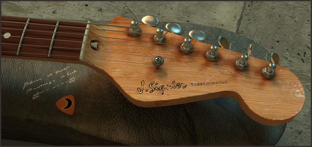 A mí también me gusta mucho cómo te ha quedado el metal. Y el detalle de la madera laminada en sección también se agradece. Por retocar algo, añadiría Supersampling (u otra cosa) a las cuerdas de la guitarra, ya que, en las zonas de alto contraste con la madera oscura queda un poco quebrada. Saludos de Drakkhen rotor.