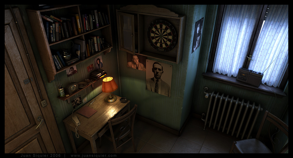 Muy buena la escena. Entre los detalles que he conseguido descubrir me ha gustado mucho la respuesta a la luz de las letras del libro que está justo encima de la lámpara y por supuesto la luz de la ventana sobre la repisa, la translucidez de las cortinas, todo. Lo que menos: las fotografías, nunca me ha gustado las fotografías o los póster en las imágenes, creo que es muy difícil conseguir que queden completamente empastados. Un saludo y enhorabuena por la imagen.