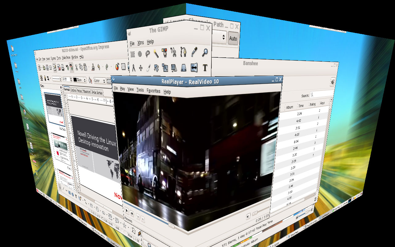 Y otros vídeos: http://cache.Novell.com/cached/xglre...ansparency.mpg. http://cache.Novell.com/cached/xglre...om-Windows.mpg. http://cache.Novell.com/cached/xglre...desktoporg.mpg. http://cache.Novell.com/cached/xglre...esktopspin.mpg.