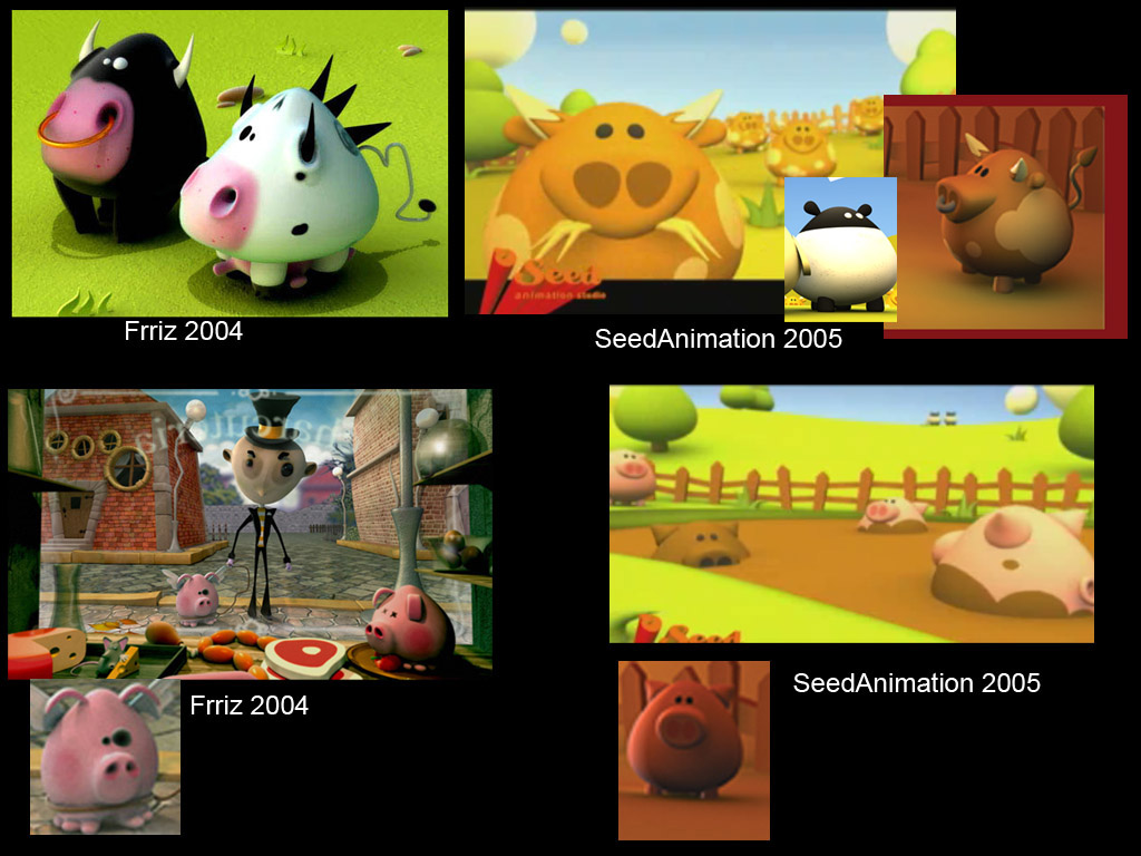 Lo vi anoche y no he podido preguntar a mi hermano, a ver lo que piensa, pero a mí se me parecen mucho, no sé. Sera hola. De hecho, el corto está bastante gracioso. ¿Qué opináis vosotros? La imagen de la vaca y el toro salío en 2004 en 3dtotal, la del cerdo pues fue portada de 3dtotal en un CD de texturas también por el año pasado. Y ahora me veo un corto con unos personajes, cuanto menos parecidos.