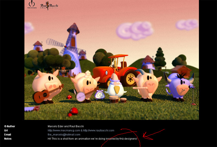 Saludos. Bueno, hace tiempo que mi hermano (Ferriz) colocaba imagencitas de sus animalitos en 3dtotal y tal. Bueno, ayer, casualmente estaba visitando 3d total y me encontré con una noticia de unos cortos de no sé qué, y digo, no sabía que mi hermano hubiera hecho un corto, y efectivamente, no lo había hecho, pero los personajes casualmente me recordaron mucho a los suyos. ¿vosotros que opináis? La web del corto es: http://www.frerangeanimation.com/, el trabajo de mi hermano, pues www.Frizz.com/Fran.