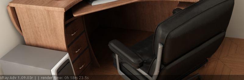 También quiero destacar la piel de la silla, enhorabuena. Ahora bien la imagen en general no tengo muy claro lo que le pasa, pero la veo algo rara, me parece muy plana, tal vez falta de contraste, ¿no ves las sombras algo derramadas? Como que no se proyectan como deberían.