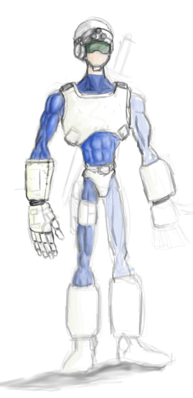 Hola. He empezado esta mañana a hacer un nuevo personaje. Esta vez quería hacer uno original. La idea es crear un soldado futurista, con toques de ciborg y de espionaje, todo dentro de la estética cartoon. Os pongo lun boceto rápido para que veáis por dónde van los tiros, (manos y pies enormes, cabeza estirada, etc).