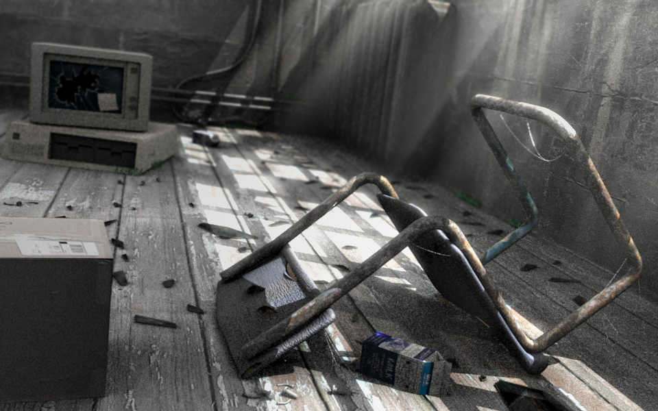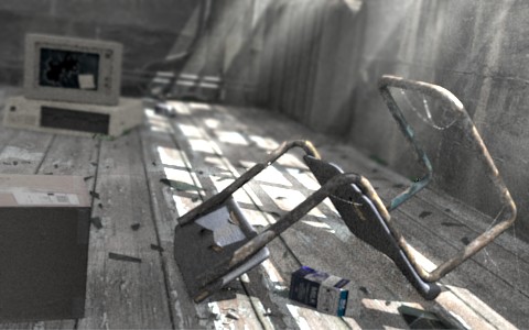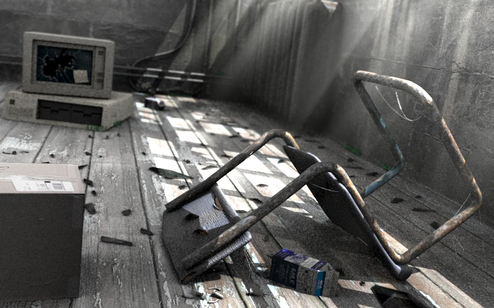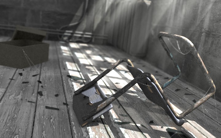 Podrías añadir un poco de polvo en el aire, con partículas o en postproducción. También telas de araña en la silla o en alguna esquina daría más detalle. También añadiría algún que otro objeto por la escena para dar la sensación de poco espacio.