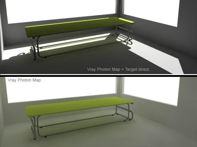 El caso es que será uno de mis primeros trabajos con los secundarios de Vray en Photon Map, antes usaba Quasi - Montecarlo, pero con el mapa de fotones, me he llevado una sorpresa. Aunque la calidad de iluminación global me ha parecido notablemente mejor con el mapa de fotones, cuando agrego una Target Direct para simular la luz solar, la escena de interior pierde mucha iluminación global y todo se oscurece demasiado perdiendo así la claridad que da el mapa de fotones.