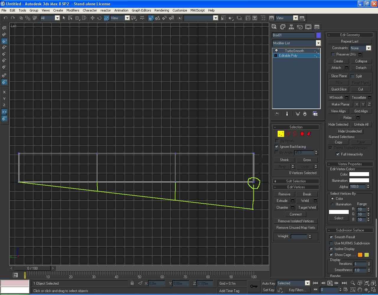 Pues si sombra efectivamente me he colado, me he confudido con crear una Spline que es ahí donde se restringe el eje. Como veo que es un Edit Poly yo lo hari así: tiro de todos los vértices hacia abajo hasta que me sobre caja, me agarro mi quiqslice, herramienta que uso hasta la saciedad y en el visor frontal corto por dónde quiero, tiro lo que me sobra selecciono el borde y le meto un cap, sin salir de Edit Poly y en 3 clik, el corte inclinado, pero recto. Un saludo.