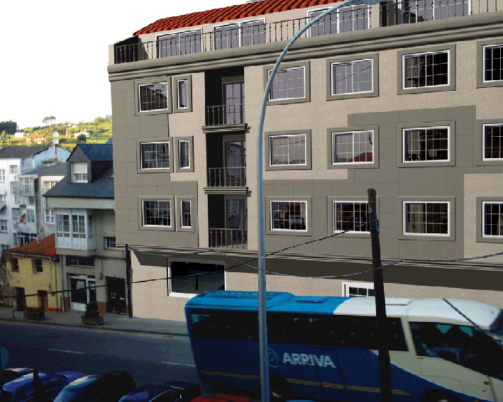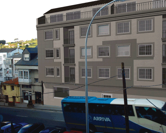 Yo creo que hay un pequeño problema en las sombras. Los colores de la fachada son bastante oscuros. Las sombras mantienen un tono muy similar y en ciertos sitios se confunden. Esto les quita profundidad a los volúmenes del edificio y le proporciona un cierto aspecto de ilustración, que es el que finalmente impide una integración más perfecta. Utiliza unos cuantos puntos de luz alrededor del edificio (alejados) con un cierto tono azul y sombras Shadow Map. Todos con un multiplicador bajo, esto le dará una iluminación más acorde con un día nublado, luego utiliza la luz principal que ya tienes y no dudes en subirle más la intensidad. No utilices una sombra Raytrace, sino una Shadow Map suavizada, también podrías aplicarle un mapa de proyección de ruido (color gris claro y blanco), el modelado es bueno y las texturas suficientes, es en la iluminación en donde cojea un poco la imagen, si ahora le metes caña en este aspecto realizar más exteriores te resultara mucho más sencillo, también podrías añadirle un poco de reflexión y especularidad a la pintura del edificio. Saludos de Drakken rotor.