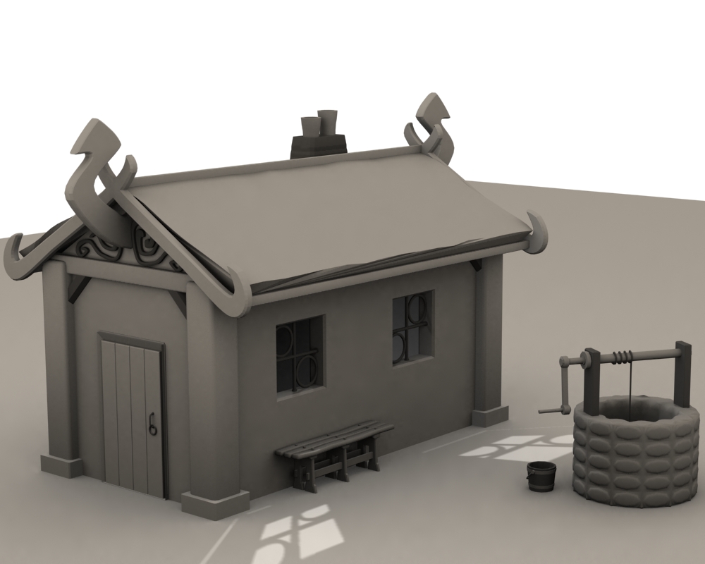 Modela un cilindro hueco y ponle una textura de piedra con displacement. No está mal la casa, ¿pero por que se ve así la parte inferior del tejado?