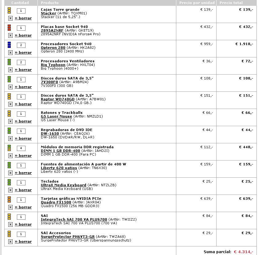 Ya puestos ponte los discos SCSI o SCSI i en vez de SATA. Mucho más rápidos y con otra forma de funcionar. Muy buen equipo si señor, pero se me escapa de precio. Por cierto, donde compras los Opteron a ese precio? Yo los había visto más caros siempre. Saludos.
