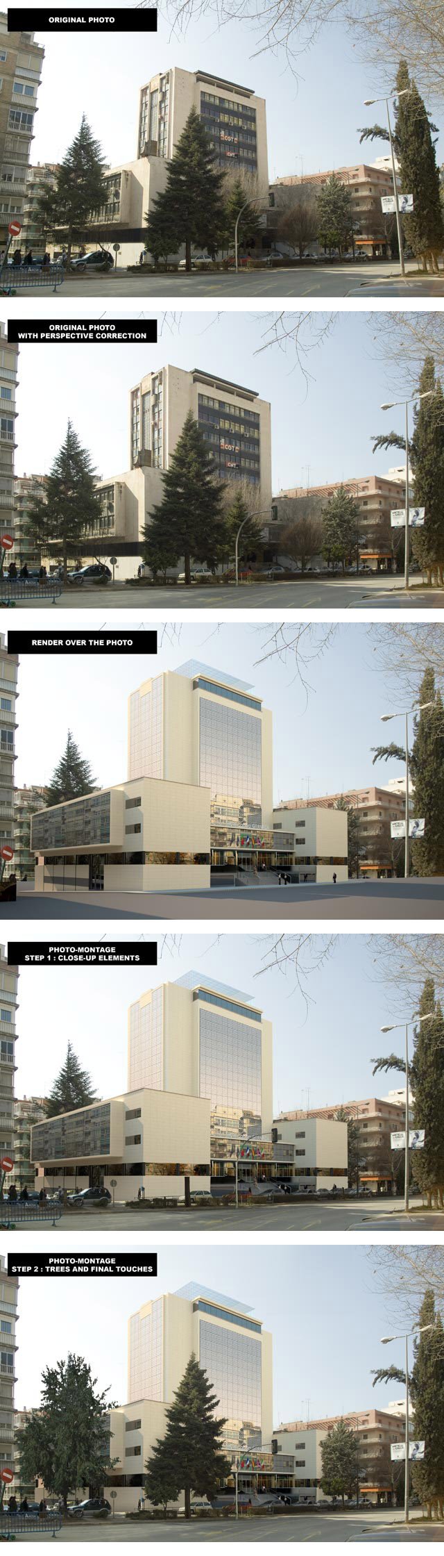 La iluminación fue un poco difícil. El sol siempre iba por detrás del edificio. La escena resultaría más atractiva con otra posición del sol. Para conseguir una buena integración, hice fotografías a los edificios colindantes y a toda la fachada opuesta de la avenida, y aplicarlas como texturas a cajas distribuidas en la escena 3d que simulan los edificios.