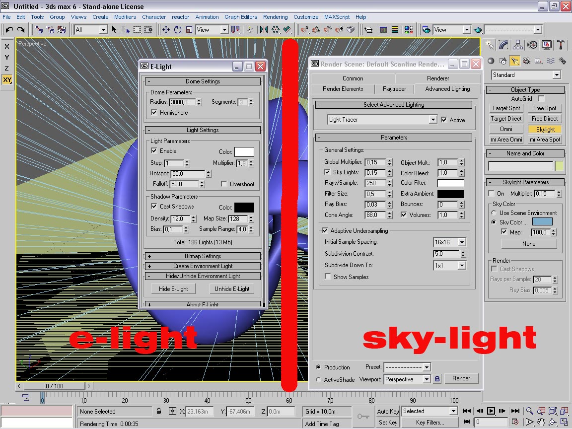 Hola. Aquí os dejo una simple comparativa de iluminación global echa con max. La comparativa consiste en el ahorro brutal de tiempo renderizando una escena (simple) con una luz por defecto de 3ds Max y un script que he encontrado por la red(e-light). No he profundizado mucho en los pros y contras en cuanto a utilizar este script en escenas más complicadas ya que espero que alguien(con algo + de tiempo que yo) se interese por el tema e investigue un poco +. Se abre la veda.
