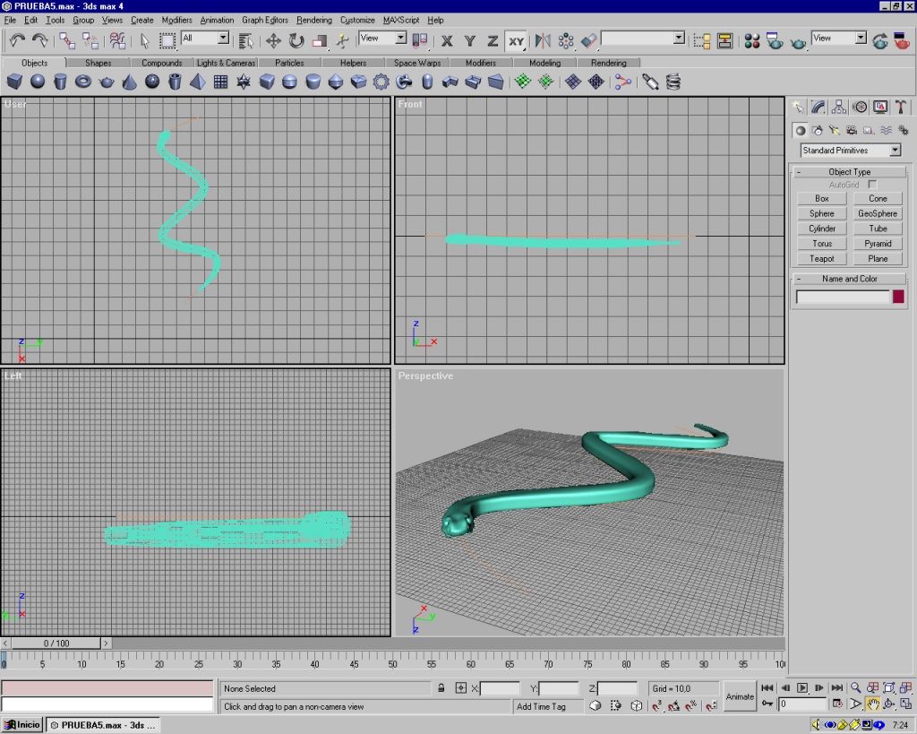 Vaya, yo me creía que las serpientes venezolanas eran como las de aquí: redondas, no cuadradas. No en serie, tiene buena pinta. Para serpiente de cartoon da el pego, para documental de Discovery Channel habrá que meterle los ojos dentro de la cabeza y arreglar la boca, cosas de las capturas de pantalla: supongo que, no pensaras animarla con el eje de coordenadas tal como lo tienes. Te aconsejo que antes de aplicarle de DeformPath corrijas el pivot de la geometría. Saludos.