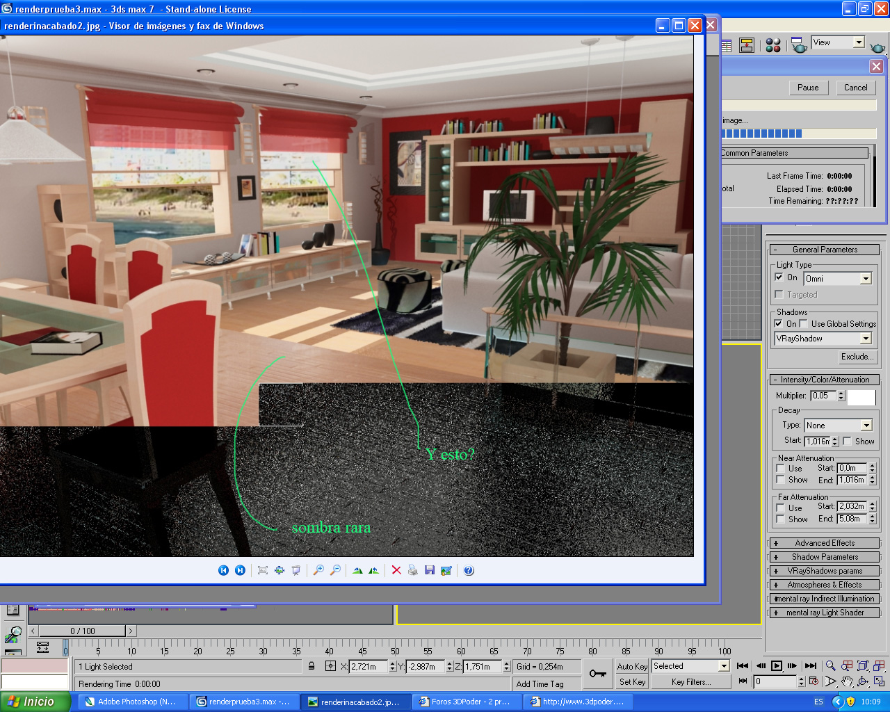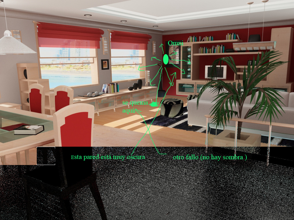 2. Pongo una omni, le excluyo el suelo, y se me quema una parte del suelo. No hay forma de iluminar esa pared subiendo las Vray, porque se me queman objetos, y con la omni se queda como yo quiero, pero me da ese problema y no lo entiendo. A ver si alguien me echa una manilla, que estoy del asjfhsdhd Vray hasta el moño ya.