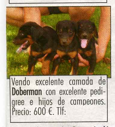 Mirando hoy una revista de segunda mano, he encontrado este anuncio y me ha entrado la ira, para mí es tráfico de animales, y no porque este pagando dinero, sino por el dinero que pide que me parece desorbitado (se que hay cachorros mucho más caro) pero son animales, y no me excusa el que tenga una línea ascendente de pura raza, ni que su padre sea un gran cazador.