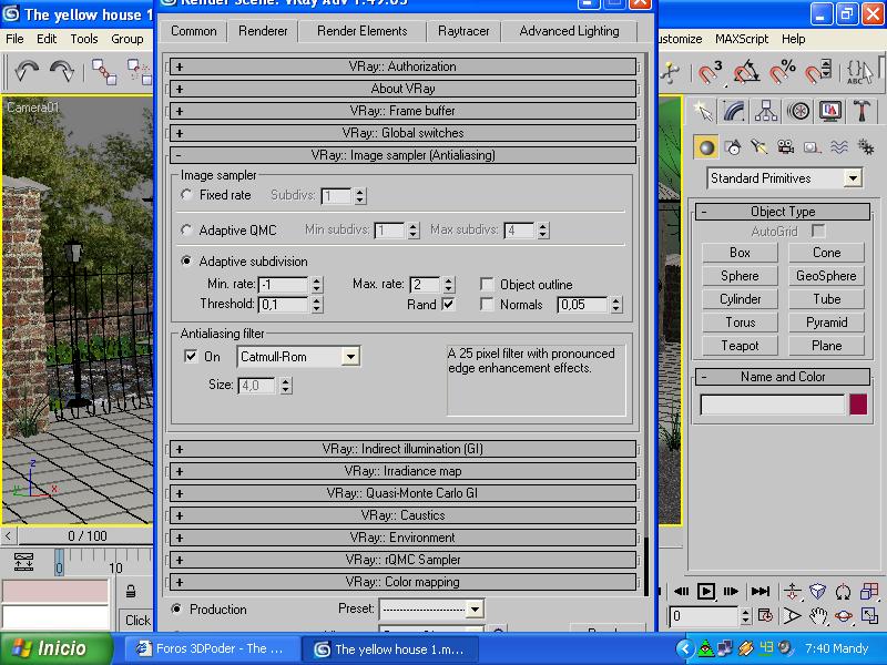 Podrías subir los parámetros en que usaste el image sampler (antialiasing) y el Quasi Montecarlo? Gracias.