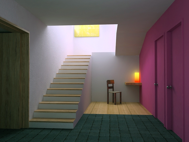 A mí me gusta muchísimo, no sé que tiene la imagen que me atrae tanto, la verdad. La iluminación esta para mí perfecta. El color fucsia ese de la derecha ha quedado que parece recién pintado, pero un pintado mate de esos perfectos, suaves, no sé, me encanta. La lámpara queda genial ahí, sin más. Las escaleras, ni tocar. Yo únicamente cambiaría el suelo de baldosines, le pondría reflexión para darle más realismo.