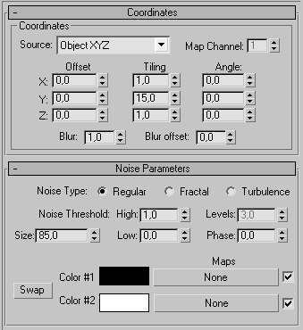 Bump: para el ruido he utilizado noise, los parámetros son los siguientes: