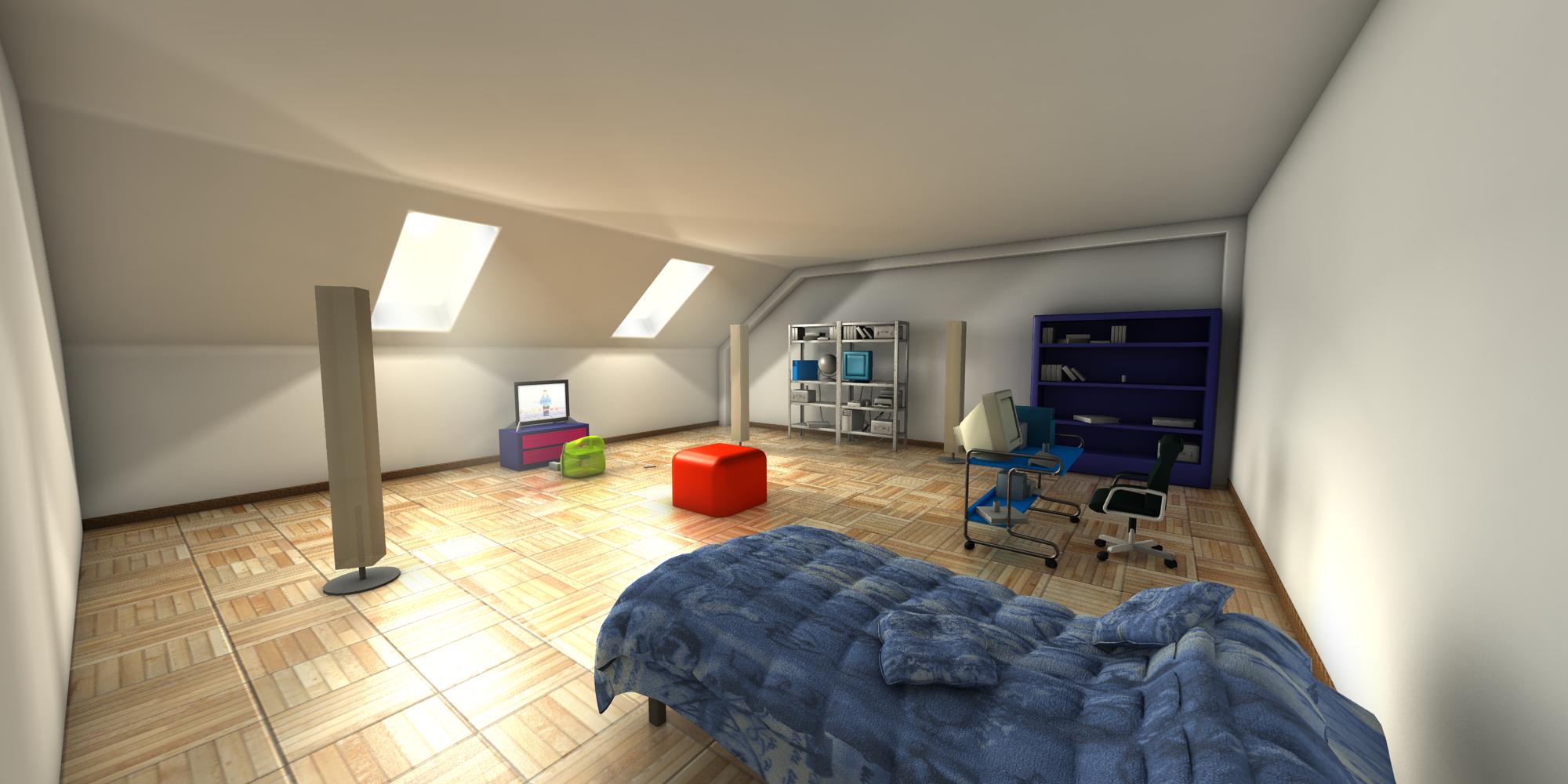 Hola. Esto es una prueba de iluminación que hice con modelos (la mayoría sin Shading) a ver qué tal quedaba una boardilla.