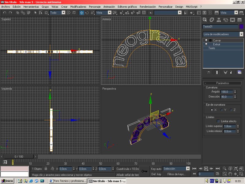 ¿Cómo hago texto curvo en 3ds Max? Trate de hacerlo con path deform y lo podía curvar solo en profundidad. La forma en que deseo lograrlo es, por ejemplo, una frase alrededor de un círculo en la vista en (front) previamente le había extruido las letras. Un saludo de Sangio.