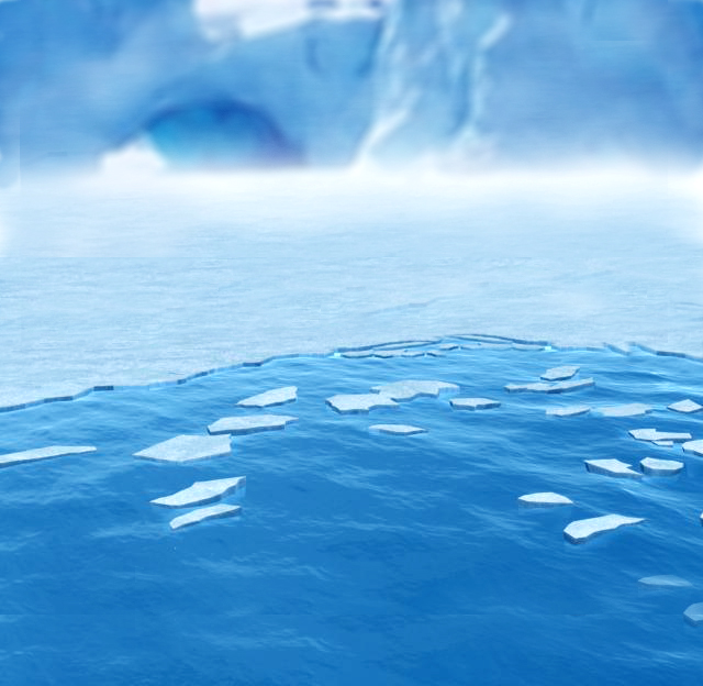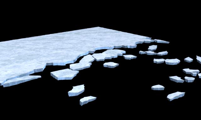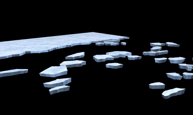 Buenas a todos. Esta vez estoy haciendo una escena, inspirada en el trabajo de Slime para las Crónicas de Narnia, en la que hay un bloque de hielo, del cual se van soltando pedazos que se lleva la corriente del agua.